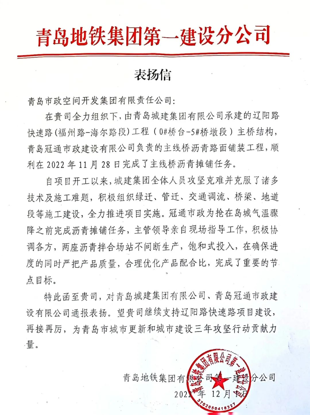日前,青島市政空間開發(fā)集團(tuán)收到了兩封來自青島地鐵集團(tuán)和青島動(dòng)車小鎮(zhèn)投資集團(tuán)的表揚(yáng)信和賀電,讓我們一起來看看吧。2022-12-09 -