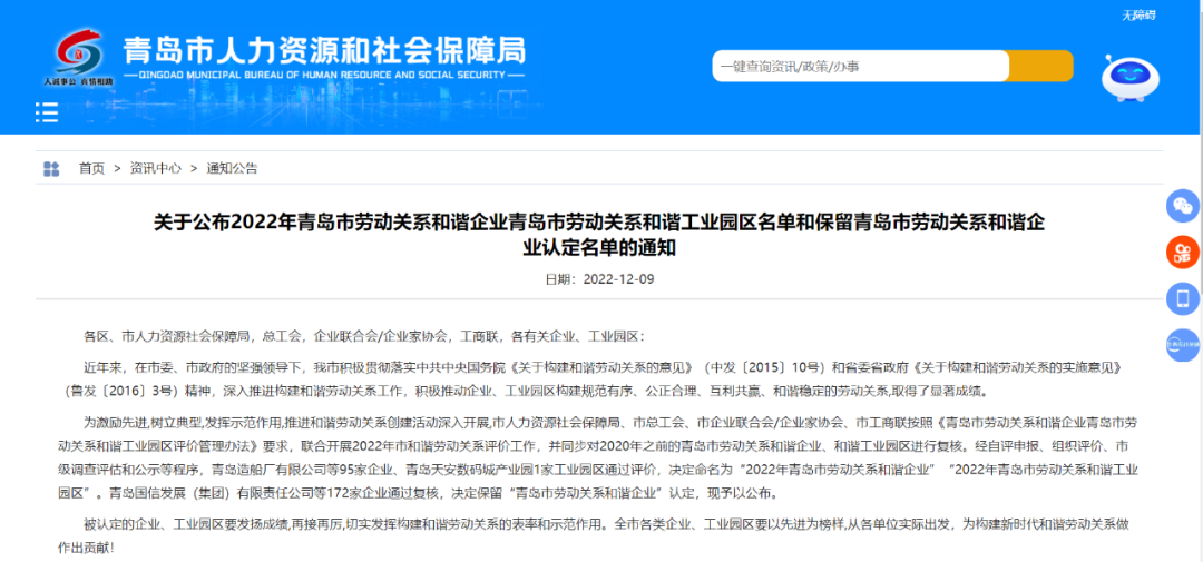 近日,青島市人力資源和社會(huì)保障局發(fā)布了《 關(guān)于公布2022年青島市勞動(dòng)關(guān)系和諧企業(yè)青島市勞動(dòng)關(guān)系和諧工業(yè)園區(qū)名單和保留青島市勞動(dòng)關(guān)系和諧企業(yè)認(rèn)定名單的通知》,青島市政空間開發(fā)集團(tuán)及第一市政、城建公司、冠通市政、市政發(fā)展榜上有名,繼續(xù)保留“青島市勞動(dòng)關(guān)系和諧企業(yè)”認(rèn)定,為進(jìn)一步優(yōu)化創(chuàng)建和諧勞動(dòng)關(guān)系提供了有力認(rèn)證和堅(jiān)實(shí)信心。2022-12-23 -