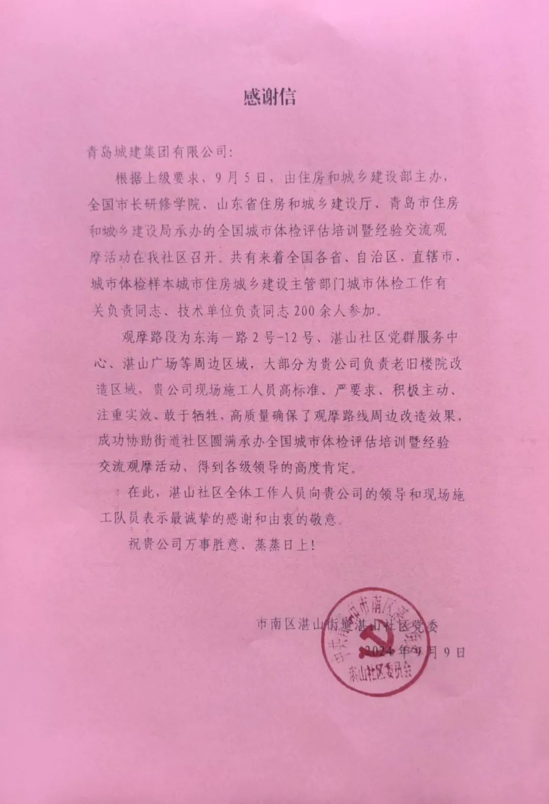 喜報(bào)!一封來自青島市市南區(qū)湛山街道湛山社區(qū)的感謝信