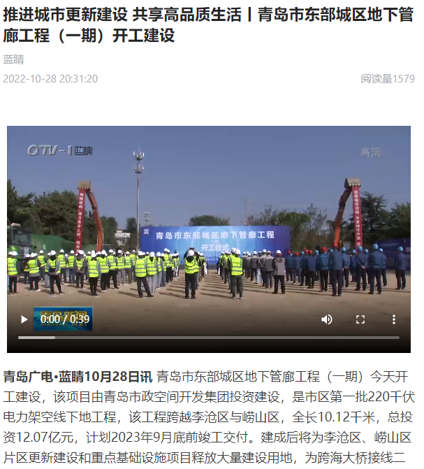 【青島新聞】推進(jìn)城市更新建設(shè) 共享高品質(zhì)生活丨青島市東部城區(qū)地下管廊工程(一期)開工建設(shè)