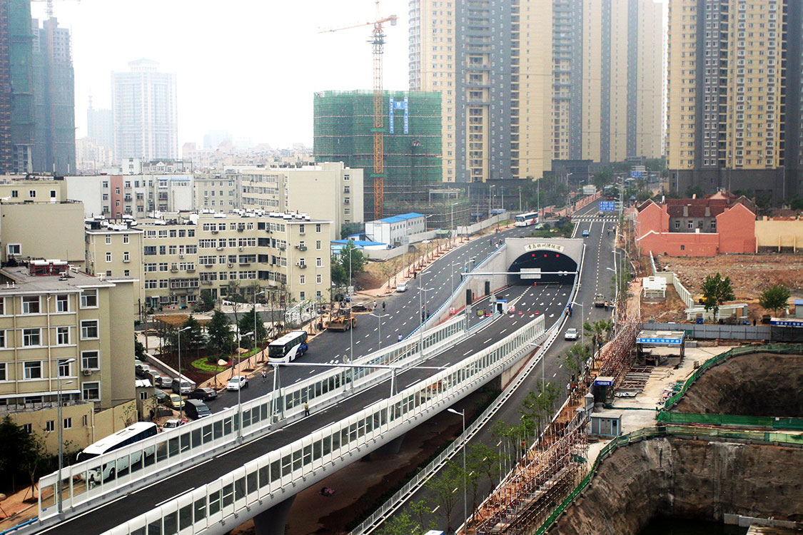 膠州灣灣口海底隧道青島端接線工程南起膠州灣灣口海底隧道青島端終點(diǎn),分別沿四川路、云南路向北,在東平路路口爬升地面后開始高架,于山西路路口上方合流后接入快速路三期工程。