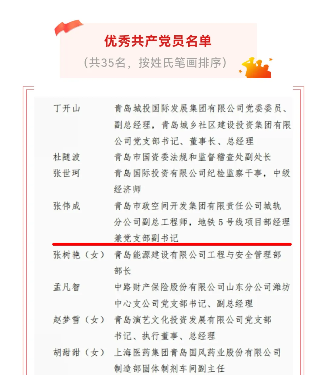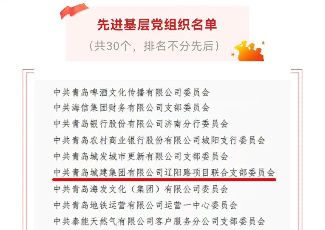 近日,集團(tuán)捷報(bào)頻傳,第一市政吉林同志被中共青島市委評為“青島市優(yōu)秀黨務(wù)工作者”,城軌公司張偉成同志獲評青島市國資系統(tǒng)“優(yōu)秀共產(chǎn)黨員”,城建公司遼陽路項(xiàng)目部黨支部獲評青島市國資系統(tǒng)“先進(jìn)基層黨組織”。