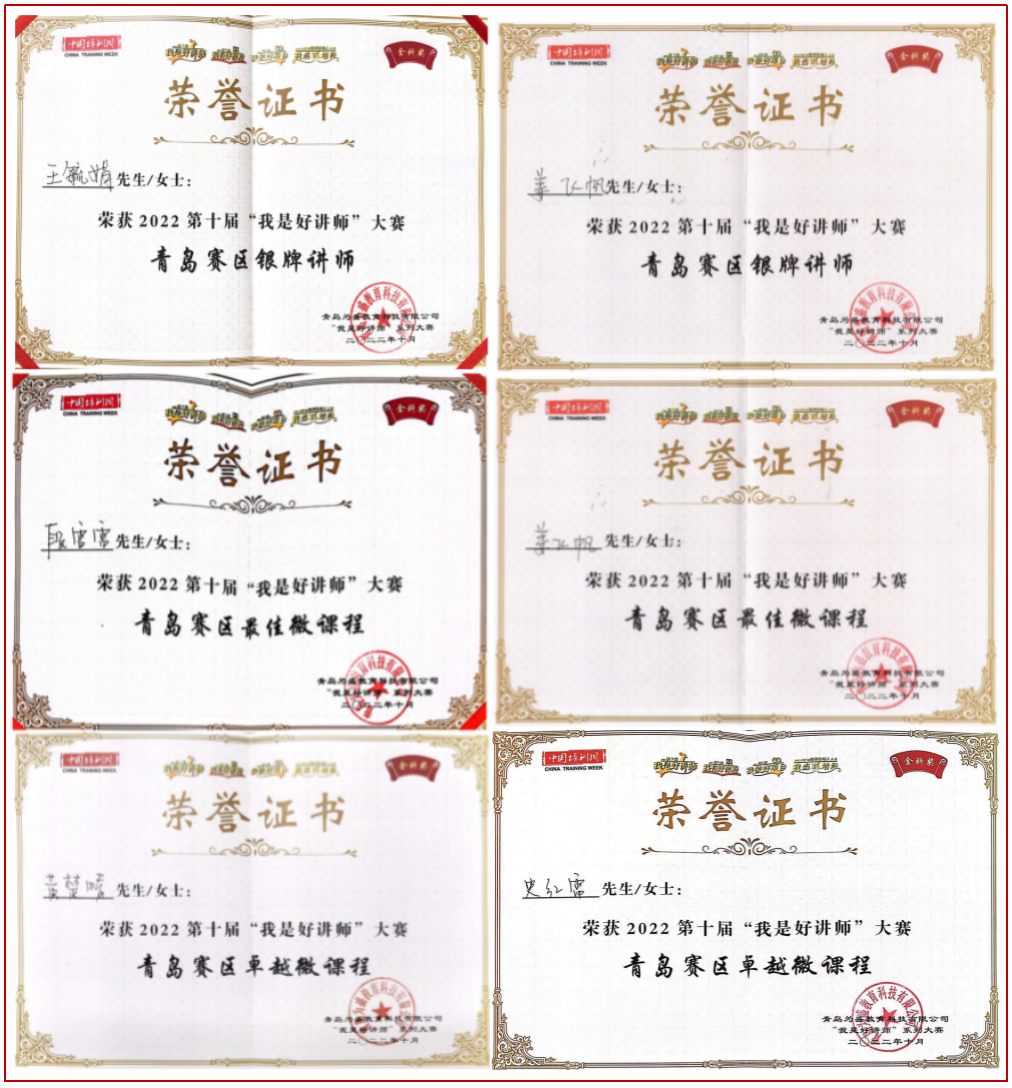 此外,在剛剛結(jié)束的《2022年全國第十屆“我是好講師”系列大賽青島賽區(qū)總決賽》上,集團5名內(nèi)訓師代表集團參賽,經(jīng)過激烈比拼,五位選手不負眾望,喜獲佳績。“好講師”環(huán)節(jié),來自城建公司的王毓娟和第一市政的姜飛帆分獲賽區(qū)總決賽第二、三名,雙雙斬獲“青島賽區(qū)銀牌講師”;“好課程”環(huán)節(jié),來自第一市政的段雷雷和姜飛帆分獲賽區(qū)總決賽第二、三名,榮獲“青島賽區(qū)最佳微課程”,來自道橋公司的黃楚晴和史紅雷榮獲“青島賽區(qū)卓越微課程”。優(yōu)異成績的取得,體現(xiàn)了集團內(nèi)訓師隊伍的專業(yè)化水平,同時也是對集團本年度內(nèi)訓師培訓成果的再一次檢驗,進一步營造了“以賽代訓、以賽促學、以賽促陪”的良好氛圍。