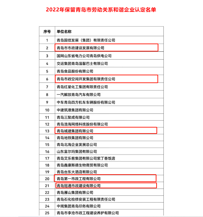 近日,青島市人力資源和社會保障局發(fā)布了《 關(guān)于公布2022年青島市勞動關(guān)系和諧企業(yè)青島市勞動關(guān)系和諧工業(yè)園區(qū)名單和保留青島市勞動關(guān)系和諧企業(yè)認(rèn)定名單的通知》,青島市政空間開發(fā)集團(tuán)及第一市政、城建公司、冠通市政、市政發(fā)展榜上有名,繼續(xù)保留“青島市勞動關(guān)系和諧企業(yè)”認(rèn)定,為進(jìn)一步優(yōu)化創(chuàng)建和諧勞動關(guān)系提供了有力認(rèn)證和堅(jiān)實(shí)信心。
