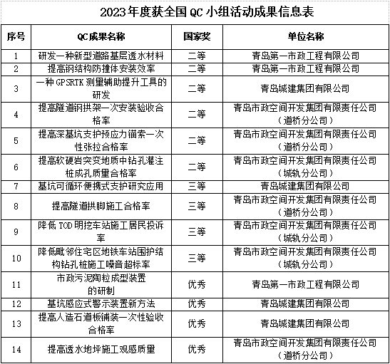 再創(chuàng)佳績!近期,集團(tuán)在2023年度山東省和全國市政工程建設(shè)優(yōu)秀QC小組活動中取得豐碩成果, 14項(xiàng)成果獲全國市政工程建設(shè)QC小組活動成果獎(jiǎng)項(xiàng),56項(xiàng)成果獲山東省市政工程建設(shè)QC小組活動成果獎(jiǎng)項(xiàng)。各單位積極參與,第一市政、城建公司、道橋公司和城軌公司均取得優(yōu)異成績。