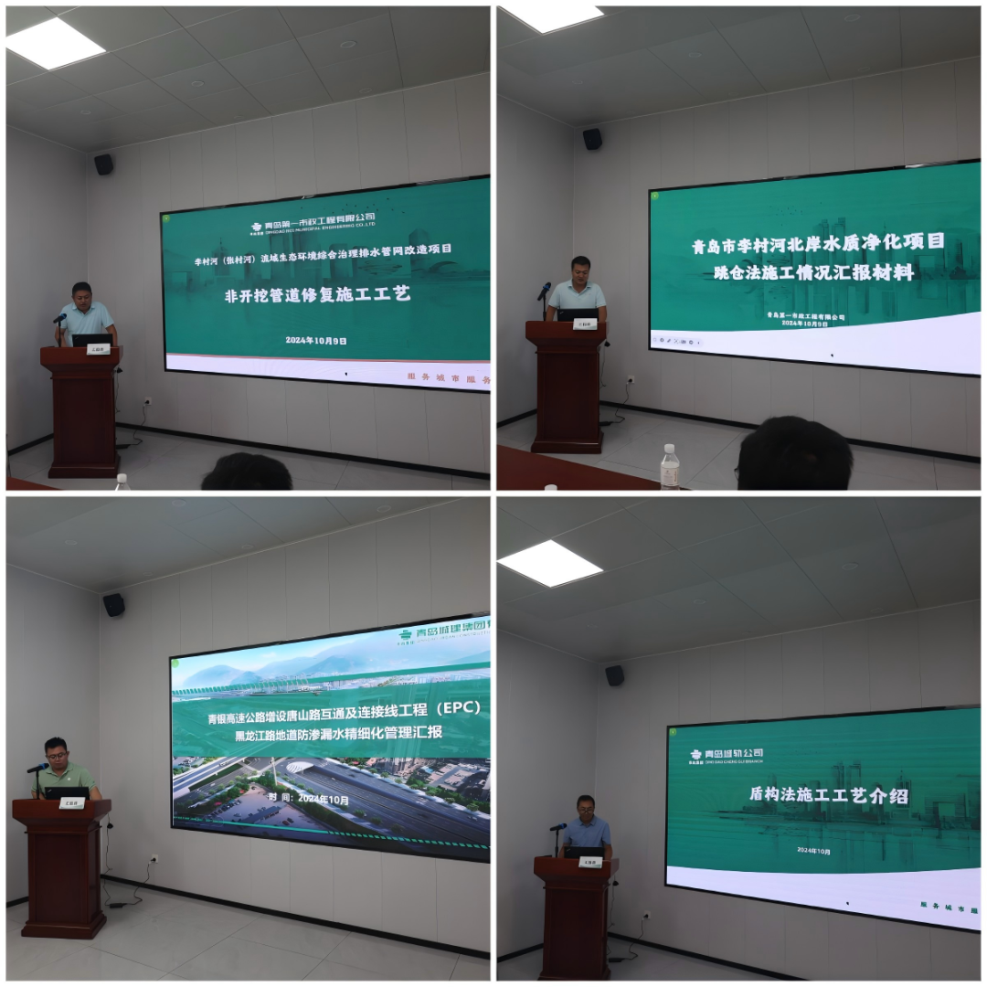 成果交流環(huán)節(jié),各單位代表逐一進行了匯報。第一市政兩河流域項目副經(jīng)理仝西亞詳解了CIPP紫外光固化與碎管法兩項非開挖修復技術(shù),并分享了標準化施工工藝要點;李村河北岸項目總工崔海洋匯報了項目部積極探索施工新方法的成功案例,通過采用跳倉法等創(chuàng)新方案,成功優(yōu)化施工、縮短工期、提升質(zhì)量;城建公司唐山路地下通道項目總工侯繼濤以《地道防滲漏水精細化質(zhì)量管理》為主題,講解了地道工程防滲漏質(zhì)量控制措施;城軌公司盾構(gòu)項目部經(jīng)理于文龍展示了盾構(gòu)施工工藝的發(fā)展歷程、國內(nèi)應用及盾構(gòu)機構(gòu)造,通過案例與數(shù)據(jù),讓參會者深刻體驗盾構(gòu)施工。各參會單位領導對此次活動進行了發(fā)言,均表示通過此次活動得以對標先進、深入學習、取長補短,拓寬了質(zhì)量管理工作的視野。