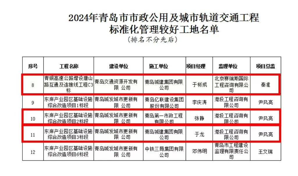 近日,青島市市政公用工程質(zhì)量安全監(jiān)督站公布了2024年市政公用及城市軌道交通工程施工現(xiàn)場標(biāo)準(zhǔn)化評(píng)價(jià)情況的通報(bào),通報(bào)表揚(yáng)了全市施工現(xiàn)場標(biāo)準(zhǔn)化管理較好的項(xiàng)目,其中集團(tuán)10個(gè)項(xiàng)目位列其中。