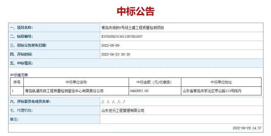 該中標項目內(nèi)容包括對自昌樂路—八號碼頭—四方車站—海云庵站—湖島站—瑞昌路站—歡樂濱海城站—環(huán)灣大道站—環(huán)鎮(zhèn)區(qū)間始發(fā)井,共七站八區(qū)間工程原材料、半成品、成品等的質(zhì)量檢測,以及對已完成的區(qū)間、車站、出入場(段)線、外電源土建工程、外配套、調(diào)流路等結(jié)構(gòu)質(zhì)量進行檢測。青島軌道市政工程檢測鑒定中心成立于2011年3月,主要從事軌道交通工程、市政工程、公路工程等多個行業(yè)和領域的工程檢測工作,目前具有CMA資質(zhì)認定、質(zhì)量管理體系認證、環(huán)境管理體系認證、職業(yè)健康安全管理體系認證、建筑工程專項檢測等專業(yè)資質(zhì),檢測能力包括8個產(chǎn)品187個項目約1400余個檢測參數(shù)。此次承接的地鐵5號線檢測項目,是該中心并入城市物業(yè)以來中標的第一個項目,也是中心成立以來中標額最大的工程檢測項目,為推動公司多元化發(fā)展邁出了堅實的一步。下一步,城市物業(yè)將持續(xù)踐行“作風能力提升年”活動要求,堅持黨建引領,圍繞集團“1333”發(fā)展戰(zhàn)略和2022年工作要點,穩(wěn)固本地市場,提高服務質(zhì)量,積極參與重大基礎設施和房屋建筑工程檢測,打造行業(yè)知名品牌。