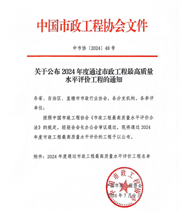 近日,中國市政工程協(xié)會公示《2024年度通過市政工程最高質(zhì)量水平評價》工程的獲獎名單,由第一市政施工建設(shè)的高新區(qū)經(jīng)二路(前海路至豐和路)道路及綜合配套工程赫然在列,該獎項是市政工程行業(yè)在工程質(zhì)量方面最高的質(zhì)量水平評價,代表市政工程行業(yè)同時期國內(nèi)先進水平,充分彰顯了市政集團在市政建設(shè)領(lǐng)域的專業(yè)水準。